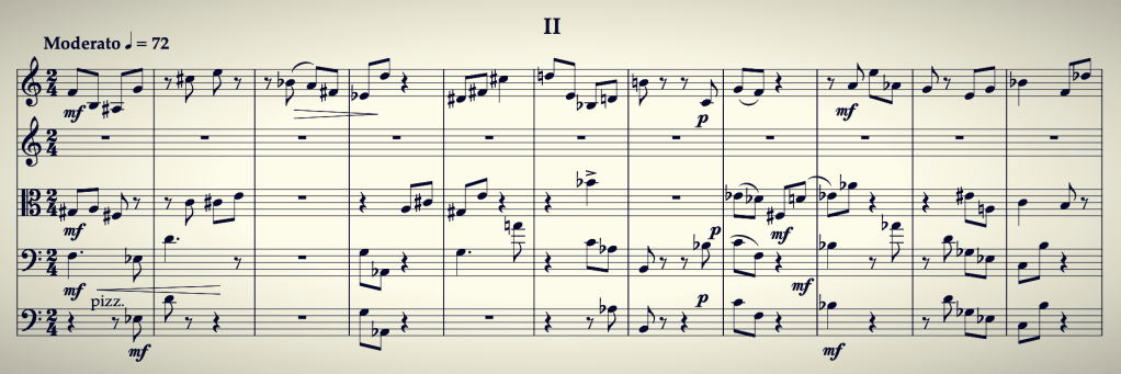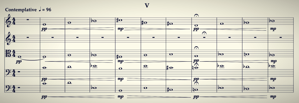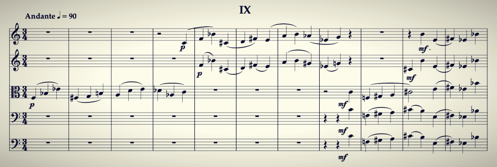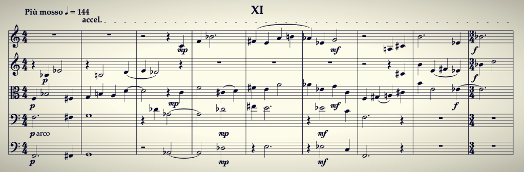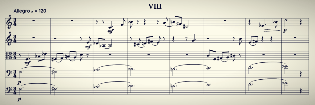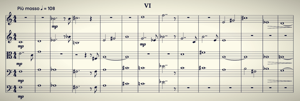 While the chamber orchestra work is organized in six movements and a coda, each miniature is excerpted below to show changing pace and textures.