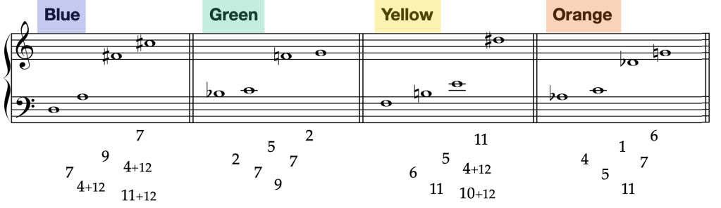 The intervals in the following example are shown in semitones. Each chord has four pitch classes and six intervals between them. The Blue chord has an average complexity rating of 3.8. Green chord is slightly more complex, at 4.3. Yellow, which includes the more complex 11-semitone Major 7ths, rates 5.5. And Orange, with the only minor 2nd 1-semitone hot dissonance, is warmest at 6.2. Try to hear the differences. (No attempt here to demonstrate a red-hot cluster mashup of pitch!)