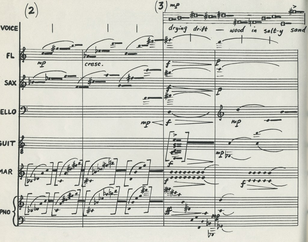 A chamber music piece titled Shores (TC-44) followed in 1978, which opened a new stream of writing for me with its completely non-metric time notation, bright arpeggiated pitch constellations, and oscillations animating the harmony and the texture.