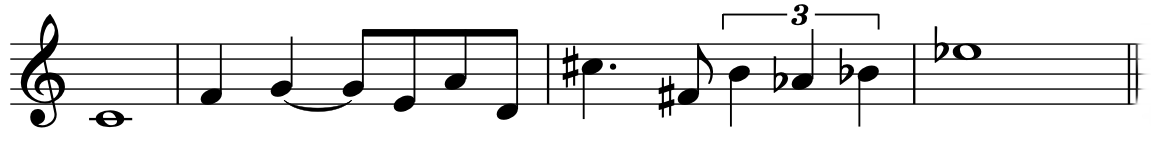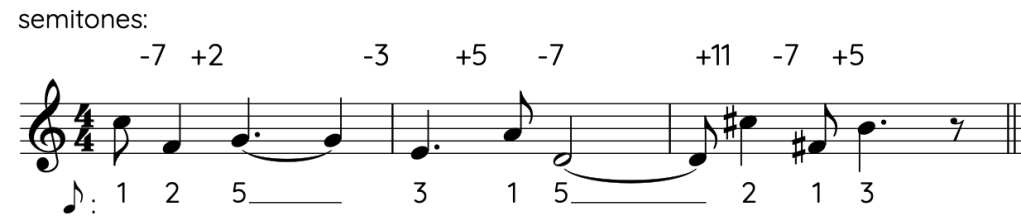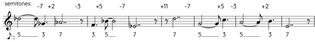 In these illustrations, the durational note values are measured below in number of eighth-notes of time. Melodic intervals are measured above in number of semitones (“half steps”). Both the intervals and the duration values measure in only prime numbers. That means though the passage is written in 4 4 time, no measure breaks down into half-measure sub-units; and no duration note value is immediately