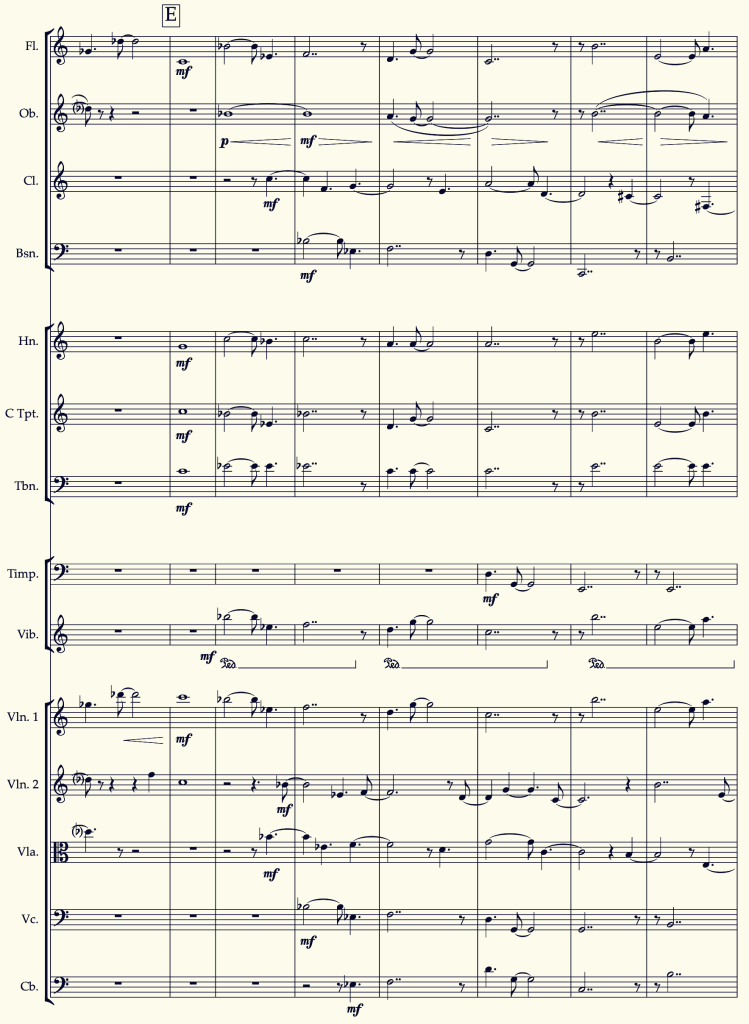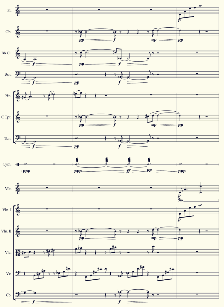 Many long-sustained sonorities, especially in the strings, maintain a quiet stillness. Others, especially in the brass, surge in crescendos and fadeaways. “Terraced” changes from loud to soft and vice versa, as well as changes from mostly string color to winds to tutti, serve like key changes in traditional tonal music to mark milestones in large-scale form.