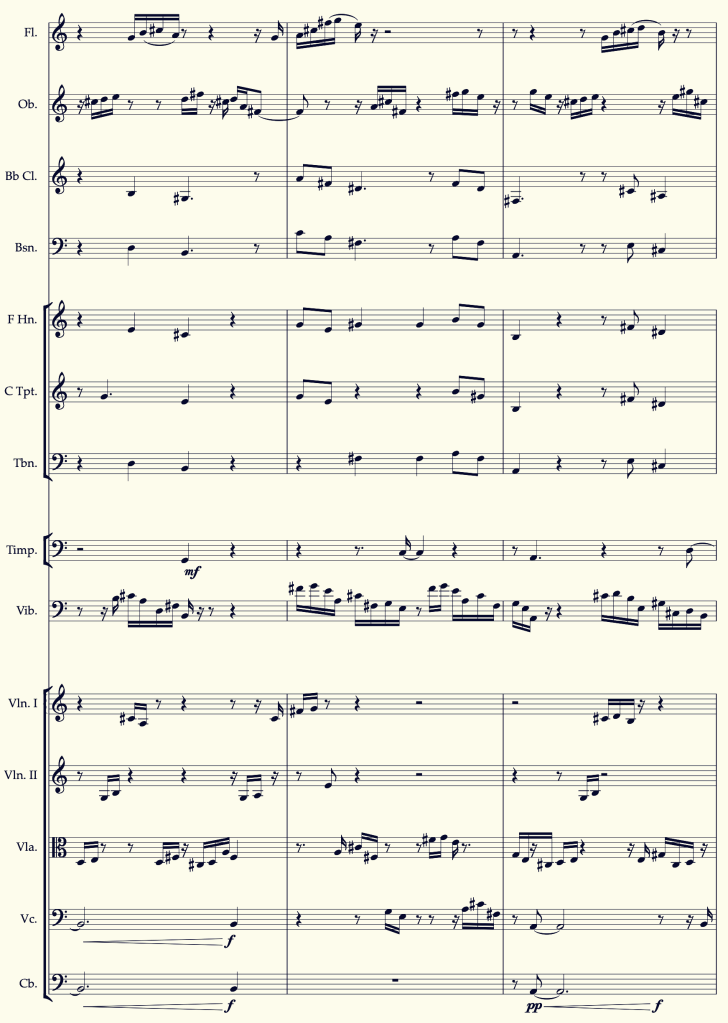 By definition, this is another palindrome. The melodic interval shape determined by these octave choices for each pitch is also a palindrome, with melodic interval sizes starting at the second note, F, increasing through the prime numbers 2 to 11, then decreasing through the same series. Though the work’s title refers to Copland, this kind of symmetrical structuring is typical of Anton Webern’s work, especially his Symphony, Op. 21. Prime numbers and palindromes underlie many of the rhythmic, melodic, and tonal structures of other pieces in the Sketchbook.