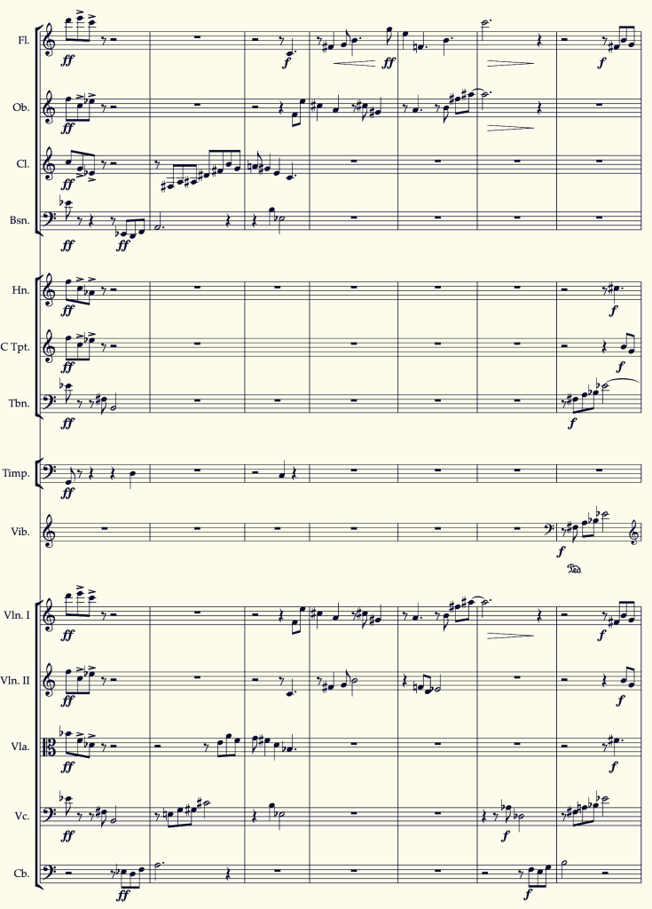 The last sketch in Sinfonia, “Jupiter Rising,” starts with a simple canon whose 12-tone melody is shaped after the first six notes of the opening theme for the finale of Mozart’s Symphony No. 41, the “Jupiter Symphony.”
