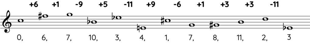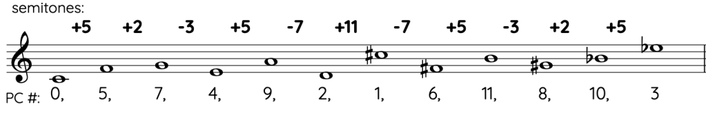 All 12 pitch classes appear just once, designated by the standard Pitch-Class (PC) numbers (C = 0) separated by commas.