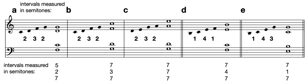 In fact, a, b, and c sound very much like sonorities typical of Copland’s 20th-century American style of tonality, featuring the open, bold rooted stability of the 7-semitone Perfect 5th. They also have no intervals one semitone larger or smaller than a unison or octave. The d and e sonorities (my favorites in the “Stack of Sevens” category) have a darker flavor – like a dark roast espresso – due to the