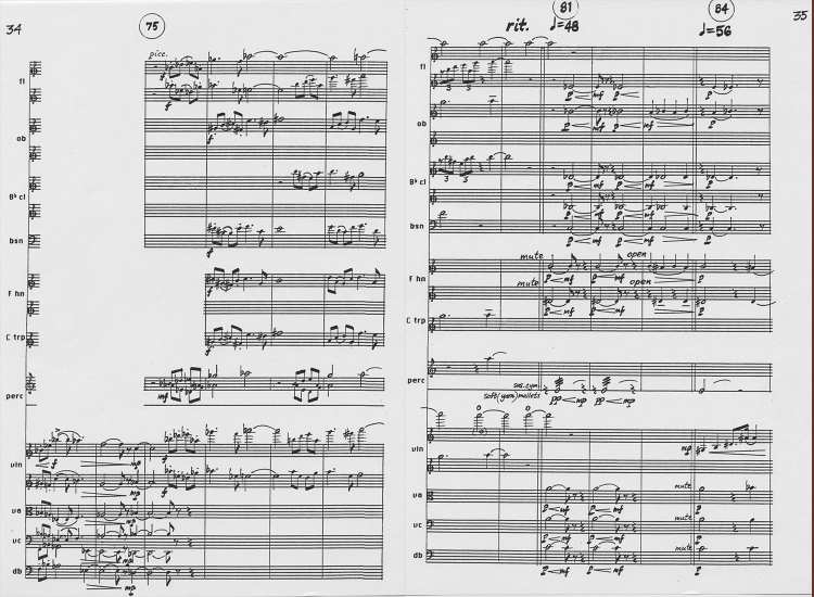 While the chamber orchestra work is organized in six movements and a coda, each miniature is excerpted below to show changing pace and textures.